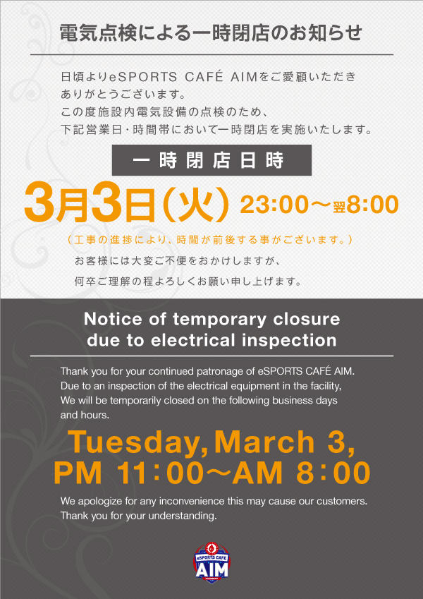 電気設備点検による店休のお知らせ